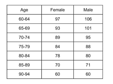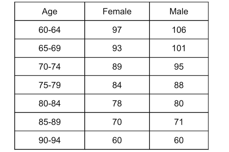 This test can be completed at home to look at your endurance. Reduced endurance can indicate a potential for increased disability. For this test you will need to stand next to a wall so that you are standing sideways to it. Mark a place on the wall with a piece of tape halfway between your knee cap and hip. If you have balance issues you may hold onto a counter, the wall, or an assistive device if you use one. Have someone start a timer. You will step(march) for two minutes bringing your knee up to the height of that tape mark each time. Only steps that reach that mark on the wall count. If you can not get your knee up that high, then don’t count it. Scores listed below are the cut off for predicting physical independence. If your score is lower there is a chance you will need help with mobility in the future. Check to see how you do!
